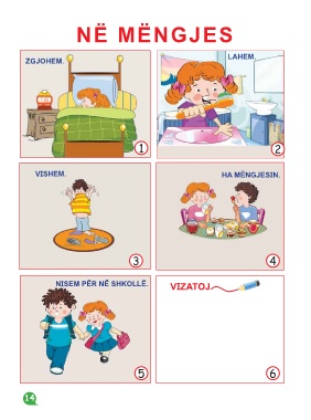 NË MËNGJES LAHEM. ZGJOHEM. 1 2 VISHEM. HA MËNGJESIN. 3 4 NISEM PËR NË SHKOLLË. VIZATOJ 5 6 14