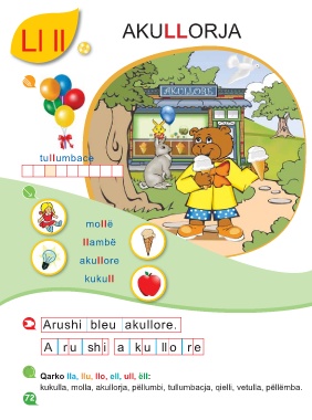 Ll ll AKULLORJA tullumbace mollë llambë akullore kukull Arushi bleu akullore. A r u sh ia k u ll o r e Qarko lla, llu, llo, ell, ull, ëll: kukulla, molla, akullorja, pëllumbi, tullumbacja, qielli, vetulla, pëllëmba. 72